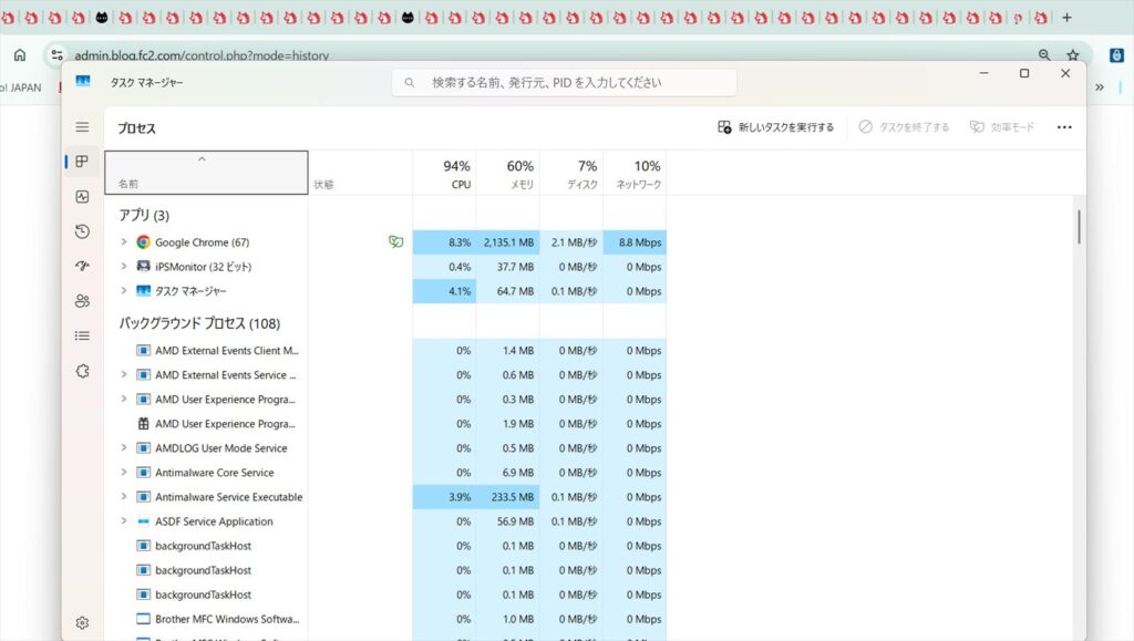 タスクマネージャを開くとたしかにメモリー使用量は85%を超えています
